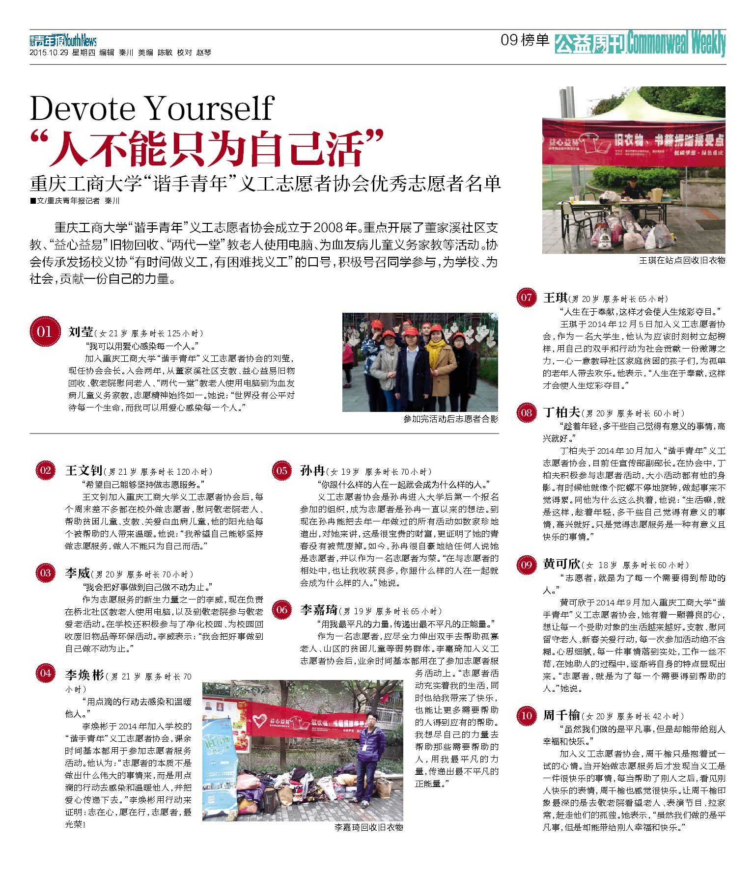 我校艺术学院影视动画分院于2008年成立“谐手青年”义工志愿者协会。一直以来,全体志愿者们全心全意致力于为社会贡献自己的爱心与力量!重点开展了董家溪市民学校支教、“益心益易”旧物回收、“两代一堂”教老人使用电脑、为血友病儿童义务家教等活动。该义协传承校义协“有时间做义工,有困难找义工”的口号,积极号召同学们参与志愿者服务活动,为学校、社会奉献自己的青春和力量。重庆青年报于 2015年10月29日在公益周刊...
