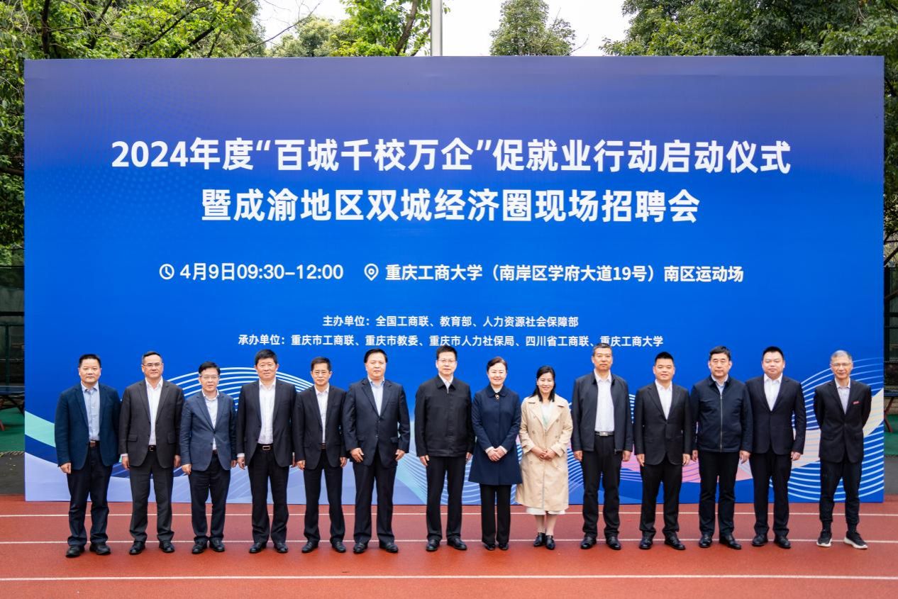 4月9日上午,由全国工商联、教育部、人力资源和社会保障部主办,重庆市工商联、重庆市教委、重庆市人力社保局、四川省工商联和我校共同承办的2024年度“百城千校万企”促就业行动启动仪式暨成渝地区双城经济圈现场招聘会在我校成功举办。全国工商联副主席方光华,重庆市委常委、统战部部长卢红,全国工商联副主席、重庆市工商联主席、赛力斯集团董事长(创始人)张兴海,教育部高校学生司(高校毕业生就业服务司)副司长王岩,...