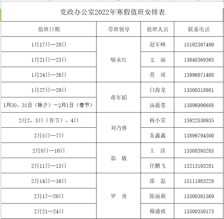 为更好地服务全校师生,保障寒假期间学校相关工作顺利开展,党政办公室每天均安排值班人员,负责学校校章、党委印章、法人印章、学校合同章、党政办公室印章等用印,学校介绍信开具,公文签发审核,会议室申请及使用等工作,请需求单位或师生按规定流程履行签批手续,其他未尽事宜,请与值班老师联系。