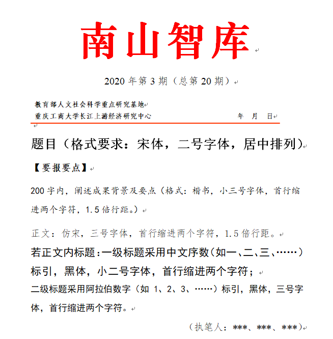 3、决策咨询成果一律以Word电子文档的形式申报(不接受纸质文稿);每篇决策咨询成果必须独立申报,不可重复申报。决策咨询成果严格按照《南山智库》体例编排,字数一般控制在3000字左右。稿件由摘要、正文、作者信息、项目来源等信息组成。