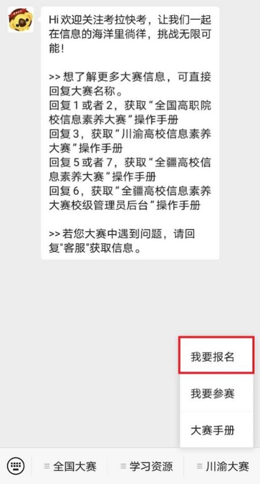 扫描下方二维码关注微信公众号“考拉快考”,进入“川渝大赛-我要报名”入口。