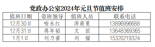 为更好地服务全校师生,保障元旦节期间学校相关工作顺利开展,党政办公室每天均安排值班人员,负责学校校章、党委印章、法人印章、学校合同章、党政办公室印章等用印,学校介绍信开具,公文签发审核,会议室申请及使用等工作,请需求单位或师生按规定流程履行签批手续,其他未尽事宜,请与值班老师联系。