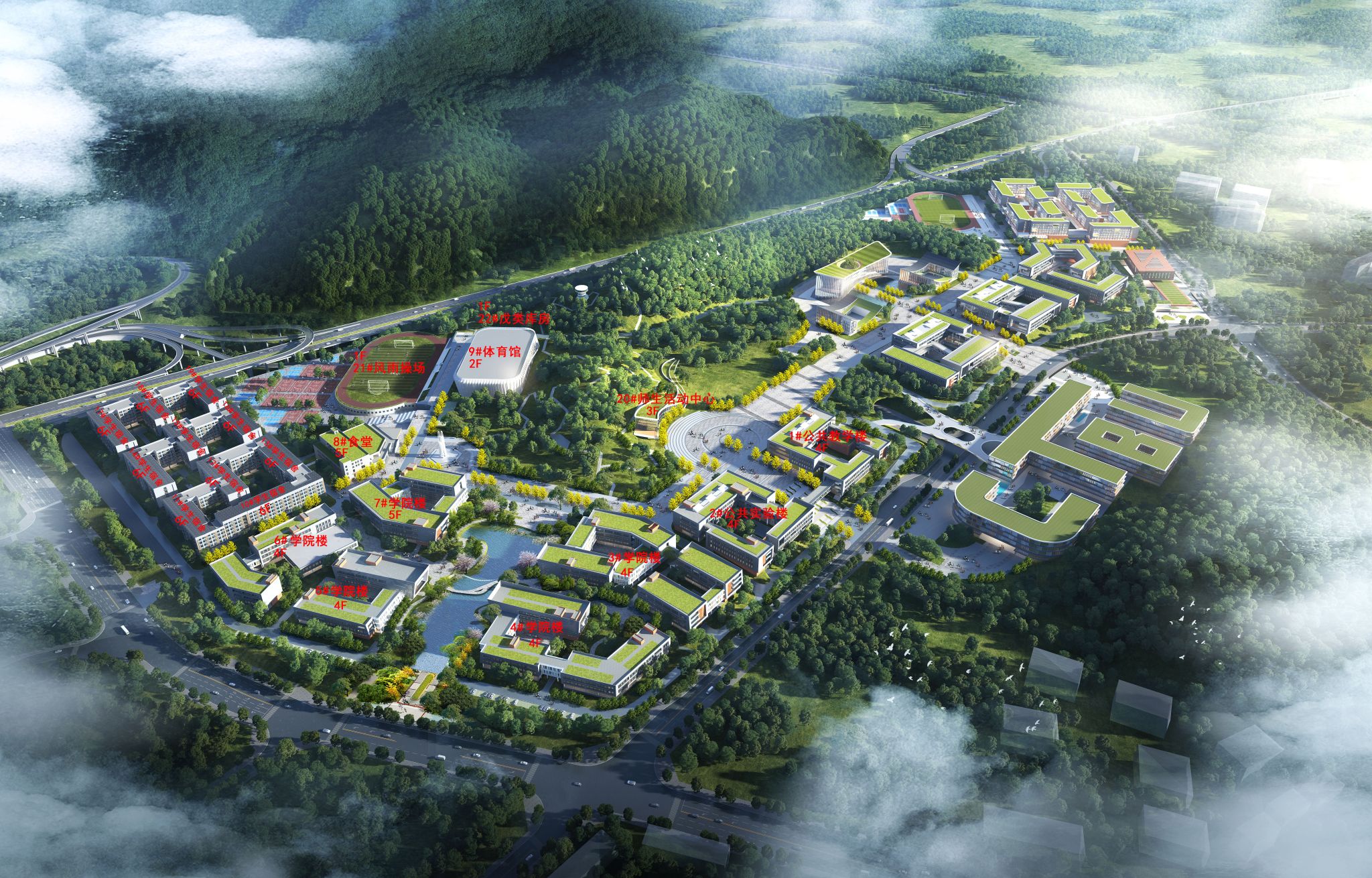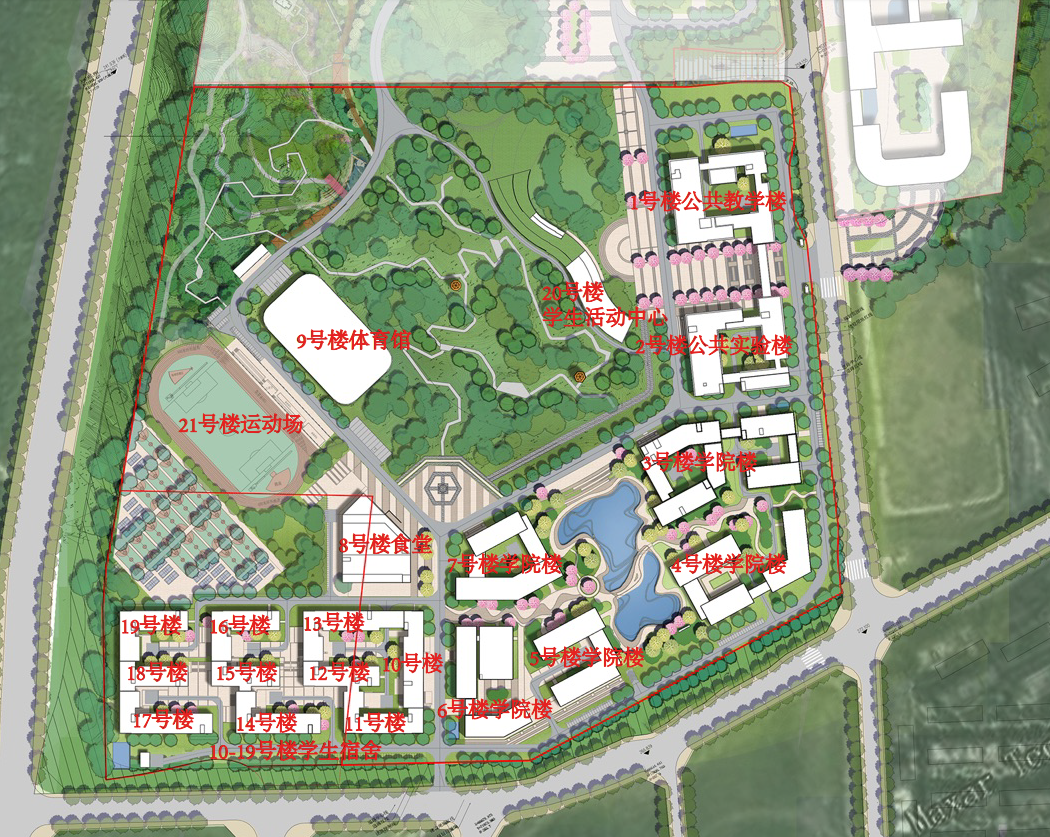 茶园校区未命名的教学楼、办公楼、实验楼、宿舍区、文体场所、食堂。(编号见效果图、平面图)