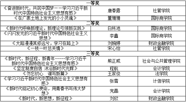 为深学笃用习近平新时代中国特色社会主义思想,引导全校青年积极投身到建设中国特色社会主义伟大实践中,由党委宣传部、学工部、校团委、马克思主义学院联合举办的“学习习近平新时代中国特色社会主义思想”主题征文活动共收到各类稿件80余篇,经评审专家严格审查打分,最终评选出论文类作品一等奖2名、二等奖4名、三等奖8名;心得体会类作品一等奖2名、二等奖4名、三等奖6名,现将获奖作者及文章题目公布如下: