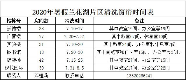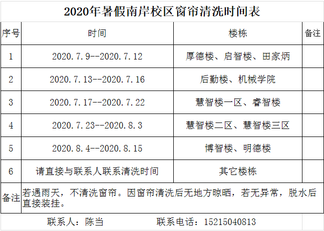 按照学校物业合同要求,今年暑假期间珠海葆力物业服务公司和新大正物业服务公司将分别对南岸校区、兰花湖片区各部门办公室、实验室、教室等公共用房的窗帘进行清洗(具体清洗时间见附表)。请各部门按照清洗时间留人开门,如有变动请主动与物业公司联系协商清洗时间。