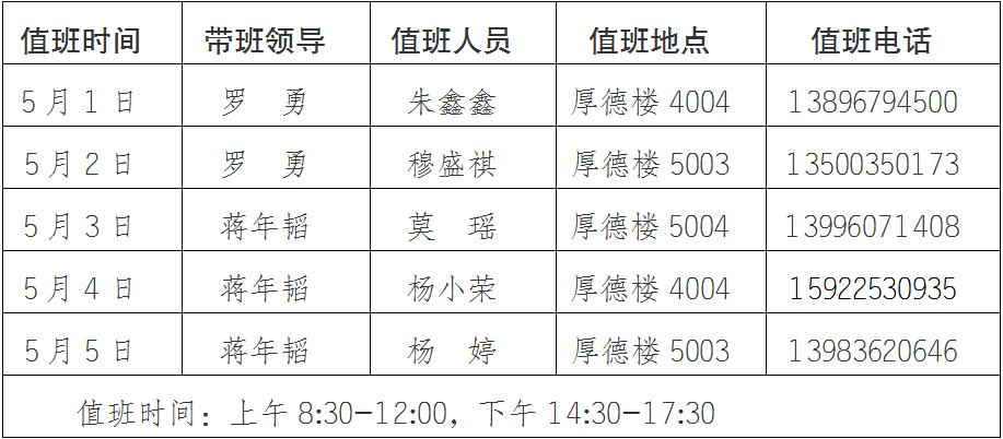 为更好地服务全校师生,保障劳动节期间学校校章、党委印章、法人印章、学校合同章、党政办公室印章等用印,学校介绍信开具,公文签发审核,会议室申请及使用等工作顺利开展,现将值班安排公布如下,请需求单位或师生按规定流程履行签批手续。
