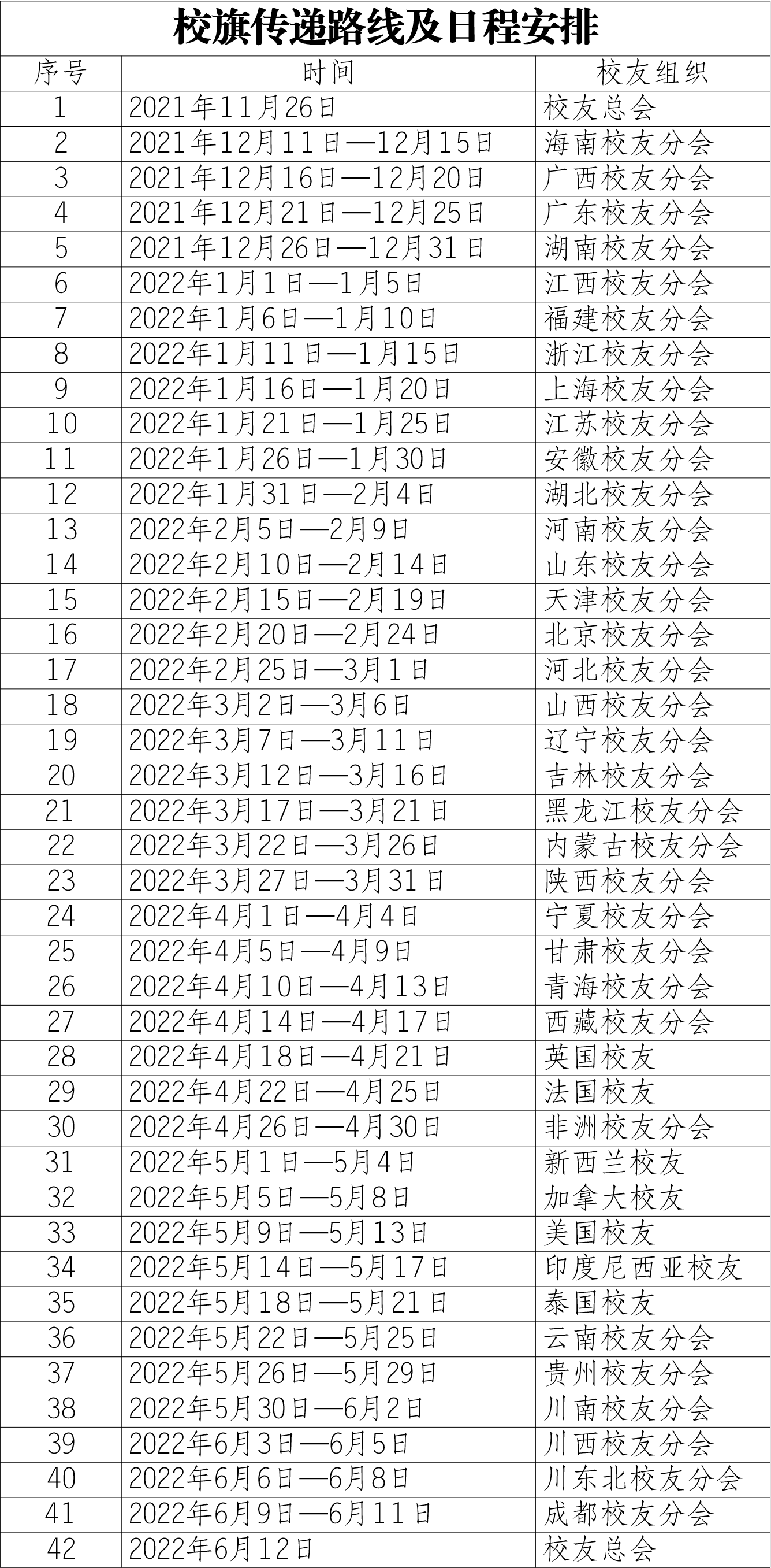 2021年11月26日启动校旗传递活动。2021年11月26日至2022年6月12日各地校友会按照规定日程进行传递,2022年6月12日校旗进入母校校庆纪念会现场。