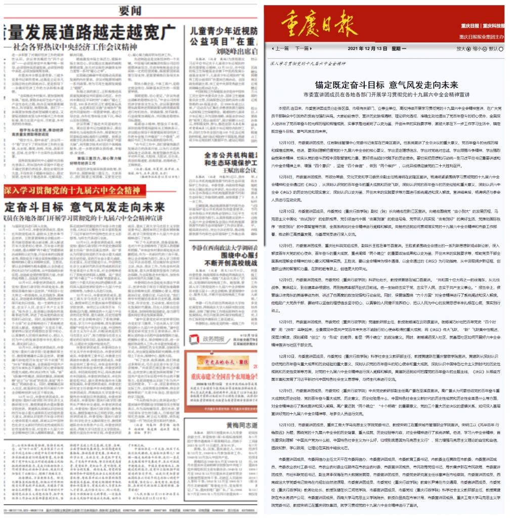 宋明江的宣讲引发热烈反响与强烈共鸣。12月13日、14日,《重庆日报》、重庆卫视对宋明江教授及其他市委宣讲团成员在各地、各部门开展学习贯彻党的十九届六中全会精神宣讲进行了报道。