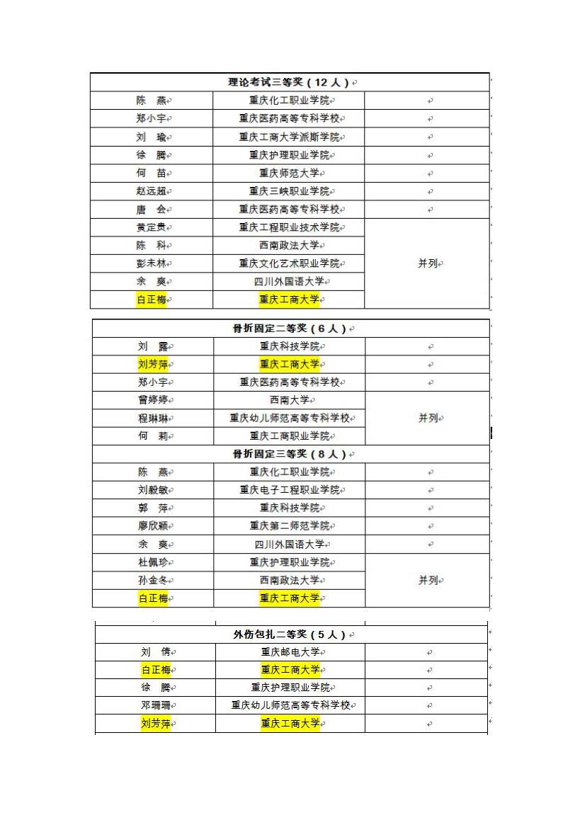 由重庆市教育委员会、重庆市红十字会主办,西南大学、重庆市中小学卫生保健所承办的重庆市校医基本功大赛于2021年12月12-14日在西南大学举行,我校校医院精心组织、积极备战,经过与全市其他高校医院激烈角逐,最终我校校医院勇夺佳绩,取得二等奖3个、三等奖2个,白正梅同志获得十佳校医荣誉称号,学校获得优秀组织奖,校医院负责人获得优秀组织者奖。