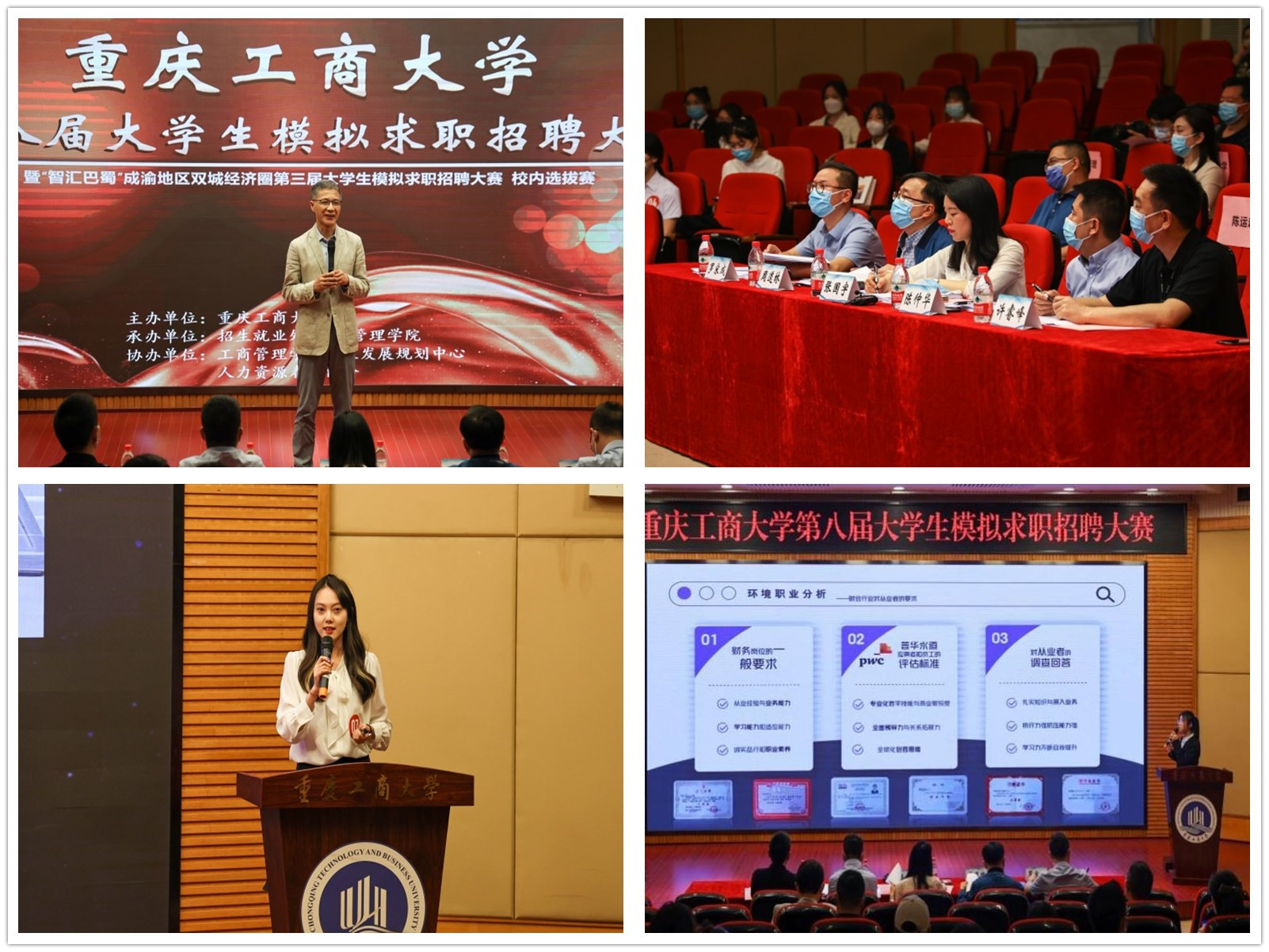 4月28日,由8xbet体育登录招生就业处主办,工商管理学院承办的8xbet体育登录第八届大学生模拟求职招聘大赛暨“智汇巴蜀”成渝双城经济圈第三届大学生模拟求职招聘大赛重庆赛区校内选拔赛在博智楼7200报告厅成功举办。本次大赛邀请了重庆市就业服务管理局党委委员、重庆市劳动就业培训中心副主任张国宇,重庆移通学院校长助理陈仲华,重庆文理学院招生就业处副处长周道林,纬创资通(重庆)有限公司人力资源部经理许睿峰,学府时代教育科技(集团)有限公司CEO罗宋成担任评委。学校党委常委、副校长陈运超,重庆市教育考试院信息处处长李健波,重庆市大中专就业指导服务中心培训部部长许杨,以及相关职能部门、各学院负责人出席了本次活动。