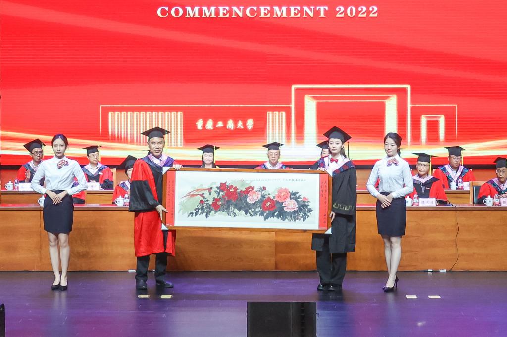 随后,2022届毕业生代表向学校赠送毕业纪念,李志雄代表学校接收2022届毕业生们对母校七十华诞的美好祝福。