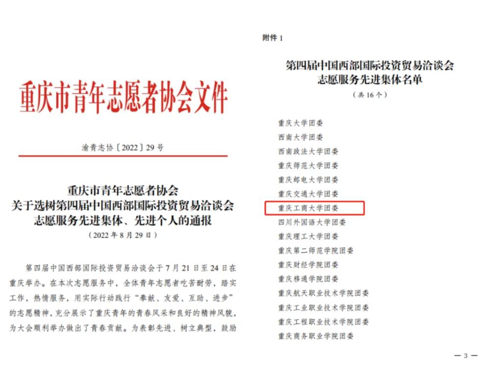 2022年7月21日至24日,第四届中国西部国际投资贸易洽谈会在重庆举办。校团委于7月积极参与赛会志愿者的招募选拔,国际商学院分团委牵头在全校范围内遴选了40余名学生参与赛会服务。