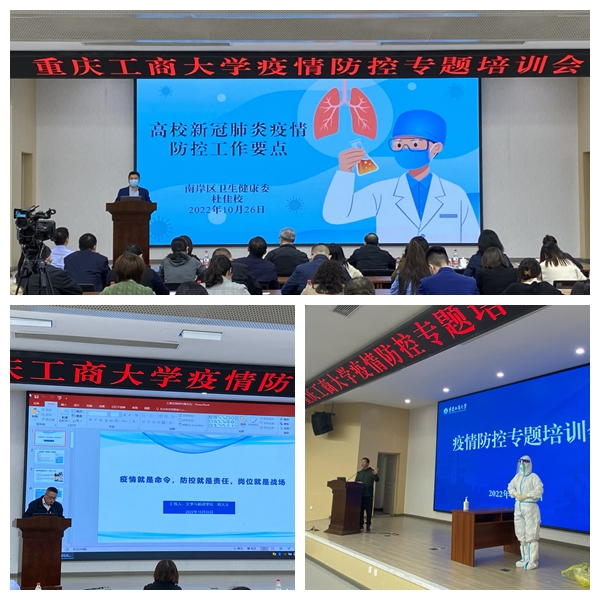 10月26日,学校在明德楼1019报告厅,通过线上与线下相结合的方式召开了疫情防控专题培训会,副校长张波、李国军,南岸区卫健委疫情防控现场处置组副主任医师杜佳校,南岸区海棠溪街道学府路社区党委书记、居委会主任张文婷,副主任夏梦雅,委员李方正出席会议;学院主要负责人、分管学生工作负责人、学生疫情防控联络人,疫情防控领导小组成员单位负责人,各单位疫情防控工作相关人员参加会议。会议由疫情防控工作领导小组办公室主任罗勇主持。