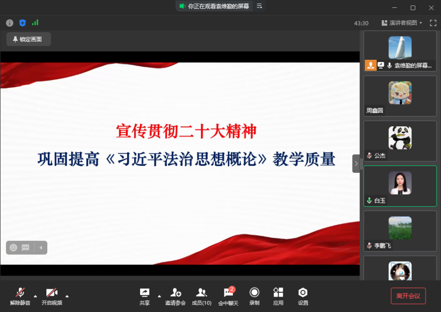 法学与社会学学院《习近平法治思想概论》课程组积极做好集体备课和线上教研活动,确保学生在有限时间内能精准有效地掌握相关原理和知识点。课程组组长袁维勤老师带领宪法、行政法方向的7位老师,在集体备课过程中,把党的二十大精神有机融入课程教学中,把党中央抗击疫情的战略部署和方针政策及时准确地传递给学生,并运用马克思主义的基本原理进行分析阐释,通过理论联系实际,引导和培养学生形成正确的价值观,有利于课程入脑入心。同时,通过线上教研活动,对近期线上课堂遇到的问题及解决方式进行交流和讨论,探索思政课线上教学提质增效的方法和路径。