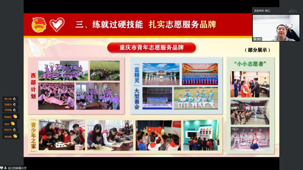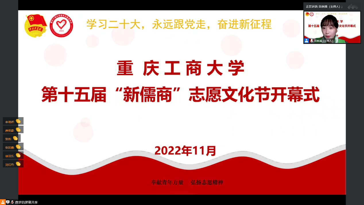 11月25日,我校第十五届“新儒商”志愿文化节开幕式在腾讯会议举行。重庆市志愿者服务指导中心主任龙江、教务处处长骆东奇、校团委副书记胡婧婷、校院志愿者组织代表、“青翠100”志愿者参加活动。