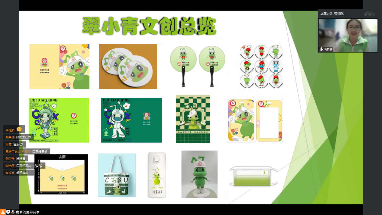 开幕式上,志愿者们一起观看了2021-2022学年志愿服务风采视频;第六届中国青年志愿服务项目大赛铜奖《“艺美乡村”助农志愿项目》做了交流分享;参与了2022年西洽会大型赛会服务的志愿者、国际商学院的白云天,投身社区疫情防控的志愿者、外国语学院的谷纤红,电商助农的志愿者、管理科学与工程学院“小云雀”志愿服务队的陈紫菁结合自己的志愿服务经历和感悟进行了分享。开幕式上还展示了校青年志愿者协会定制的“翠小青”文创周边产品。