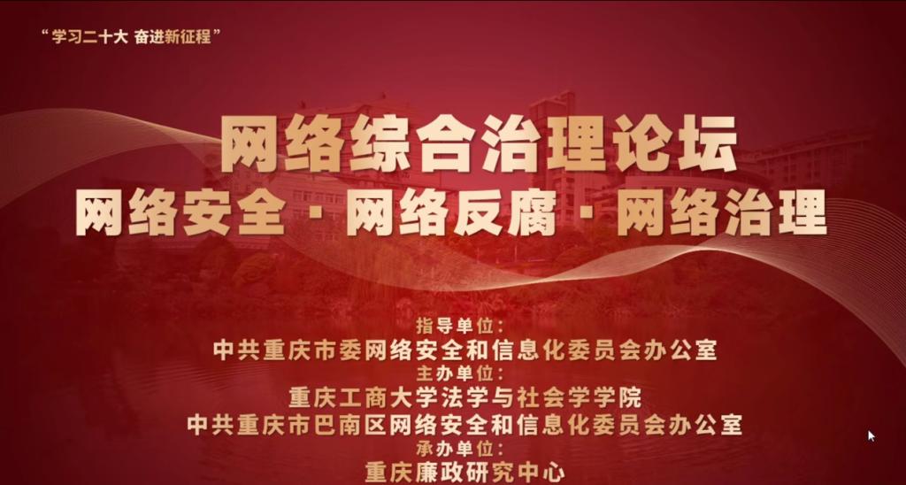 12月13日下午,由8xbet体育登录法学与社会学学院与重庆市巴南区委网信办联合主办、重庆廉政研究中心承办的网络综合治理论坛顺利召开。8xbet体育登录党委常委、宣传部长华杰 ,法学与社会学学院院长黄文,重庆市委网信办网络综合治理处处长王东,巴南区委网信办主任周庆,重庆大学法学院院长黄锡生,西南政法大学法学院院长梅传强,重庆邮电大学网络空间安全与信息法学院院副院长黄东东,重庆警察学院纪委副书记王树福,西南大学法学院教授张步文,沙坪坝区网信办主任李维,南岸区委网信办主任杨雪松,渝中区委网信办主任刘书燃,璧山区委网信办主任江波等专家领导,以及8xbet体育登录廉政中心研究员田熹文、王璐,法学与社会学学院学院各专业研究生,各区网信办工作人员,共150余人参与了本次研讨会,论坛由黄文主持。