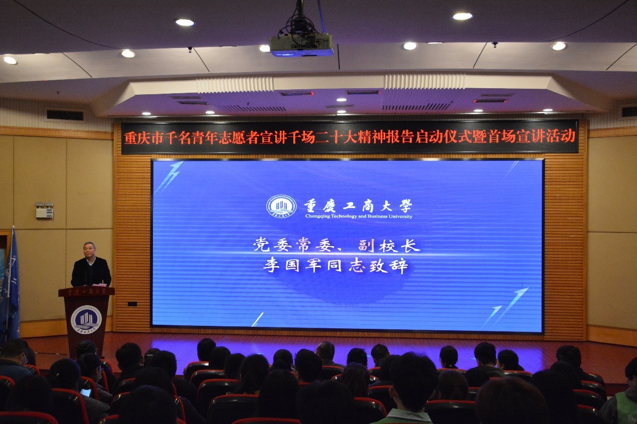 会议伊始,李国军致辞。他代表学校对各位的到来表示最热烈的欢迎,对团市委长期以来给予我校的关注支持表示诚挚的感谢。李国军谈到重庆市千名青年志愿者宣讲千场二十大精神报告启动仪式暨首场宣讲会活动在我校举行,是全校青年开展学习贯彻党的二十大精神的重要契机;我校一直坚持引导广大青年大学生上好与现实相结合的“大思政课”,在志愿服务中“受教育、长才干、作贡献”;希望广大青年志愿者将学习贯彻党的二十大精神落实到实践中,牢记习近平总书记的嘱托,让雷锋精神在新时代绽放更加璀璨的光芒,为中国式现代化建设和中华民族伟大复兴贡献青春力量。