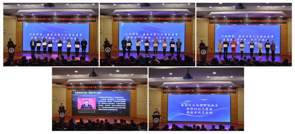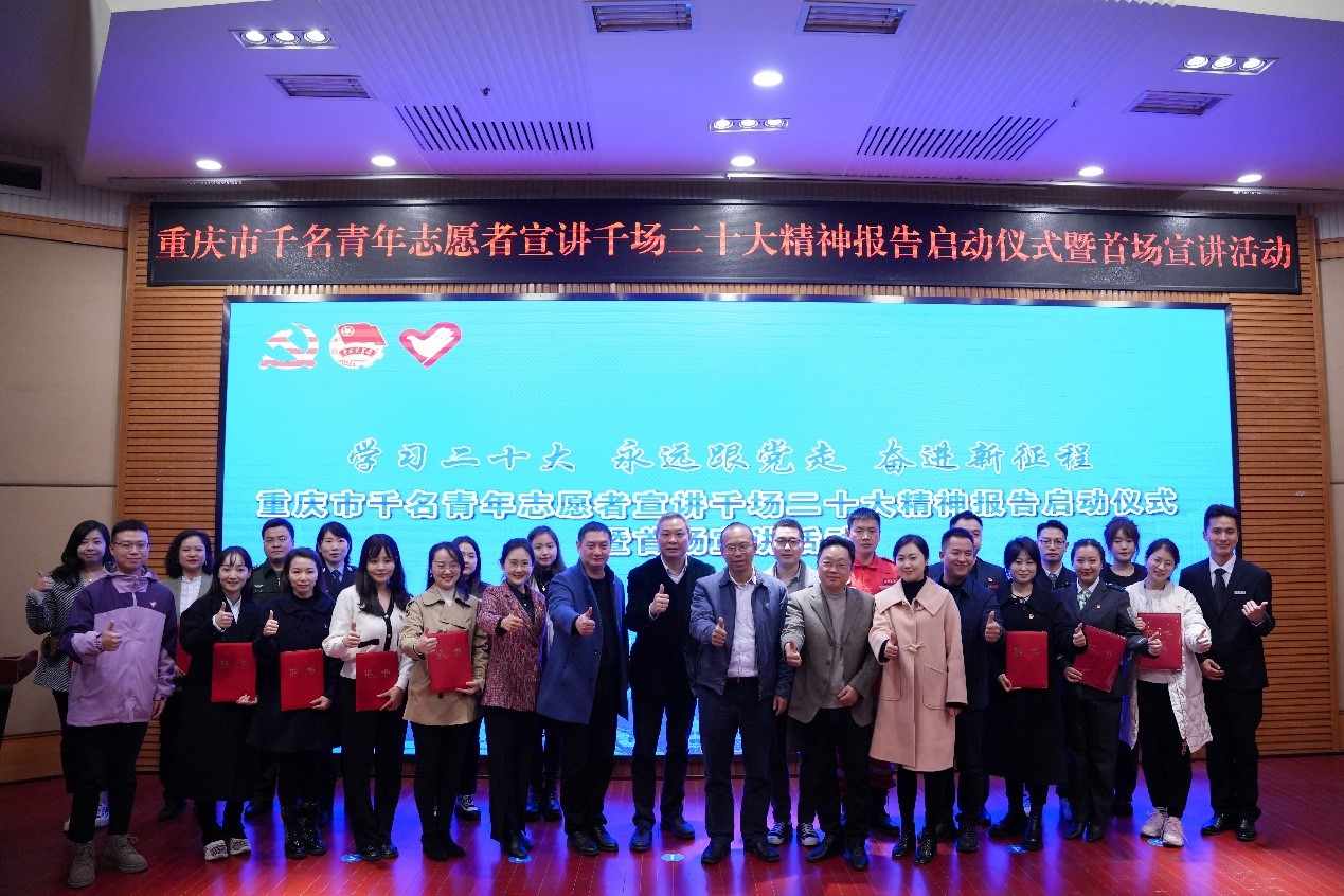 3月3日,由团市委、8xbet体育登录、市青年志愿者协会主办,市志愿服务工作指导中心、校团委承办的“学习二十大、永远跟党走、奋进新征程”重庆市千名青年志愿者宣讲千场二十大精神报告会启动仪式暨首场宣讲活动在我校南岸校区顺利举行。团市委副书记曾凯,我校党委常委、副校长李国军,市志愿服务工作指导中心党支部书记、主任龙江,我校党委学生工作部部长申卫东,市志愿服务工作指导中心党支部副书记贺伟,党委组织部副部长魏婉怡,校团委副书记胡婧婷出席本次活动。