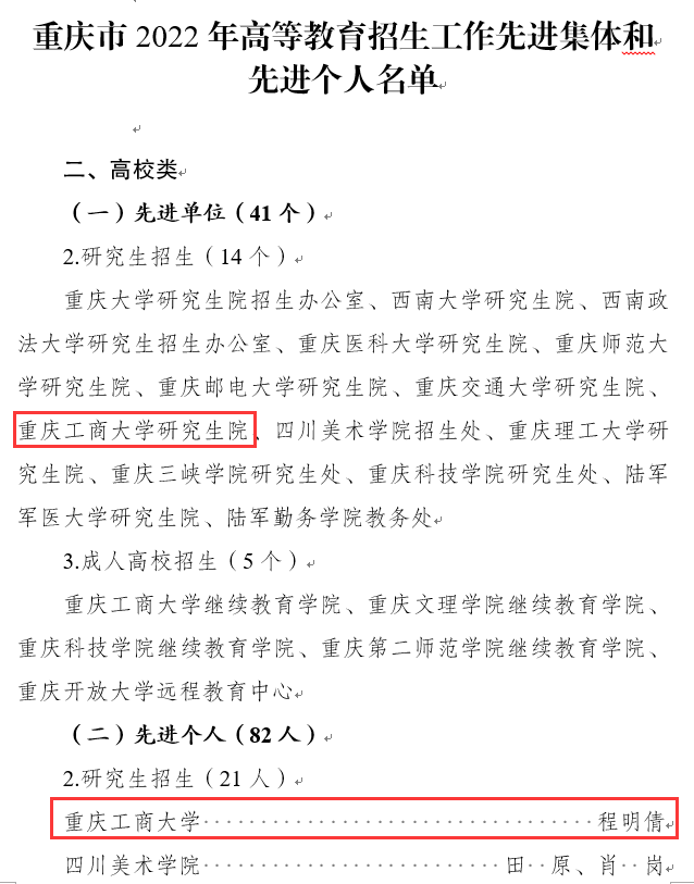 近日,重庆市教育委员会发布《关于2022年高等教育招生工作先进集体和先进个人的通报》(渝教招函〔2023〕3号),我校研究生院获评“高等教育招生工作先进集体”,程明倩同志获评“高等教育招生工作先进个人”。