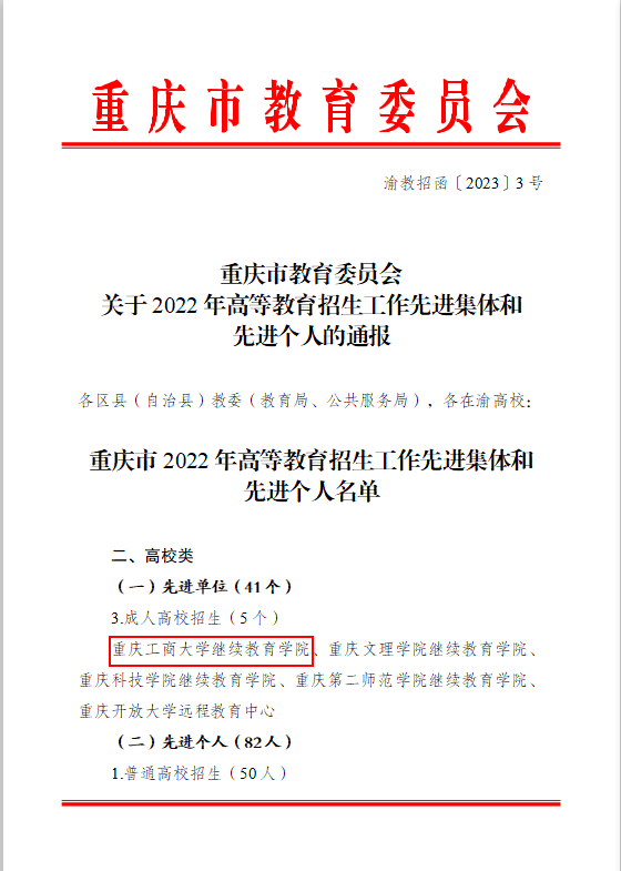 近日,重庆市教育委员会发布《关于2022年高等教育招生工作先进集体和先进个人的通报》(渝教招函〔2023〕3号),我校继续教育学院获评“重庆市成人高校招生工作先进单位”。
