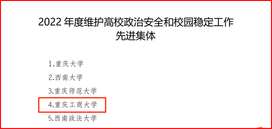 近日,重庆市教育委员会和重庆市公安局联合印发《重庆市教育委员会重庆市公安局关于2022年度维护高校政治安全和校园稳定工作先进集体和先进个人的通报》(渝教安函〔2023〕38号),我校荣获“2022年度维护高校政治安全和校园稳定工作先进集体”荣誉称号。这是自2014年以来,我校安全稳定工作连续获得的第9个先进集体荣誉称号。同时,4位同志荣获“2022年度维护高校政治安全和校园稳定工作先进个人”荣誉称号。