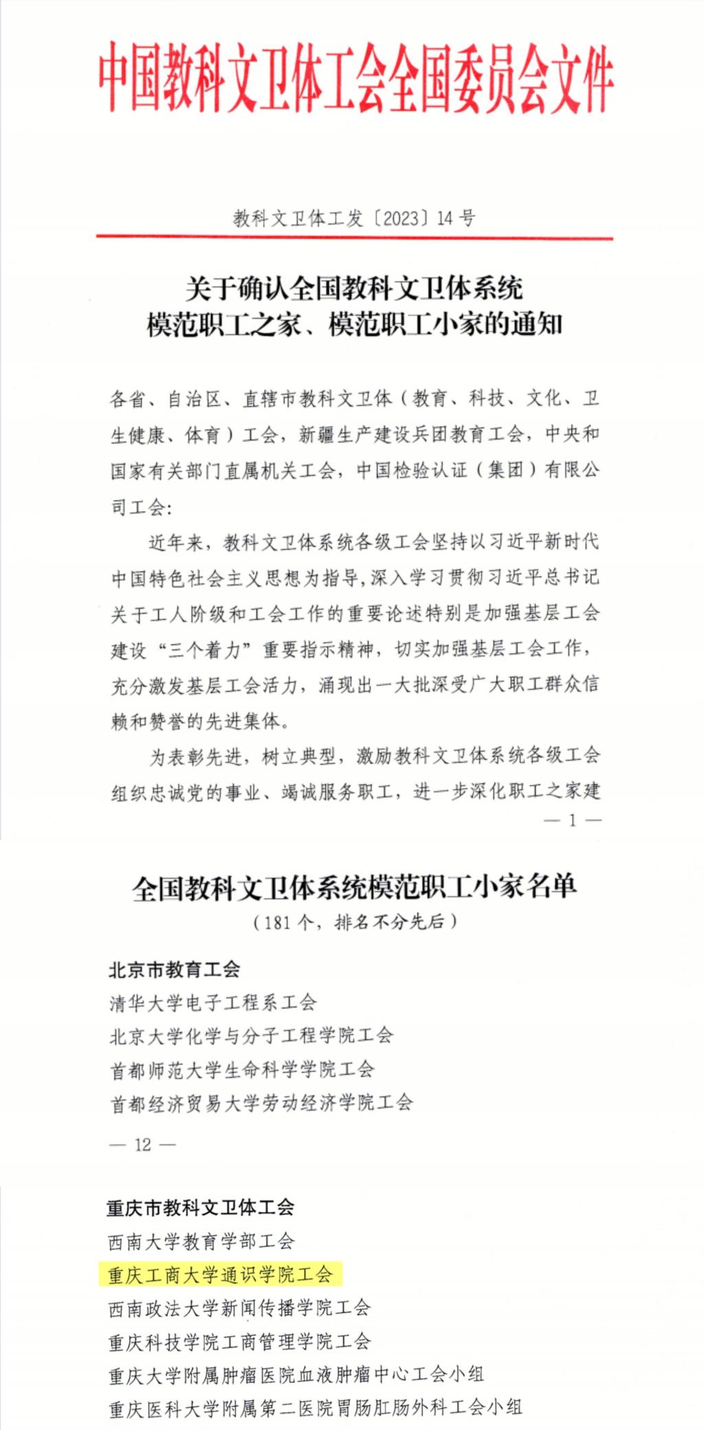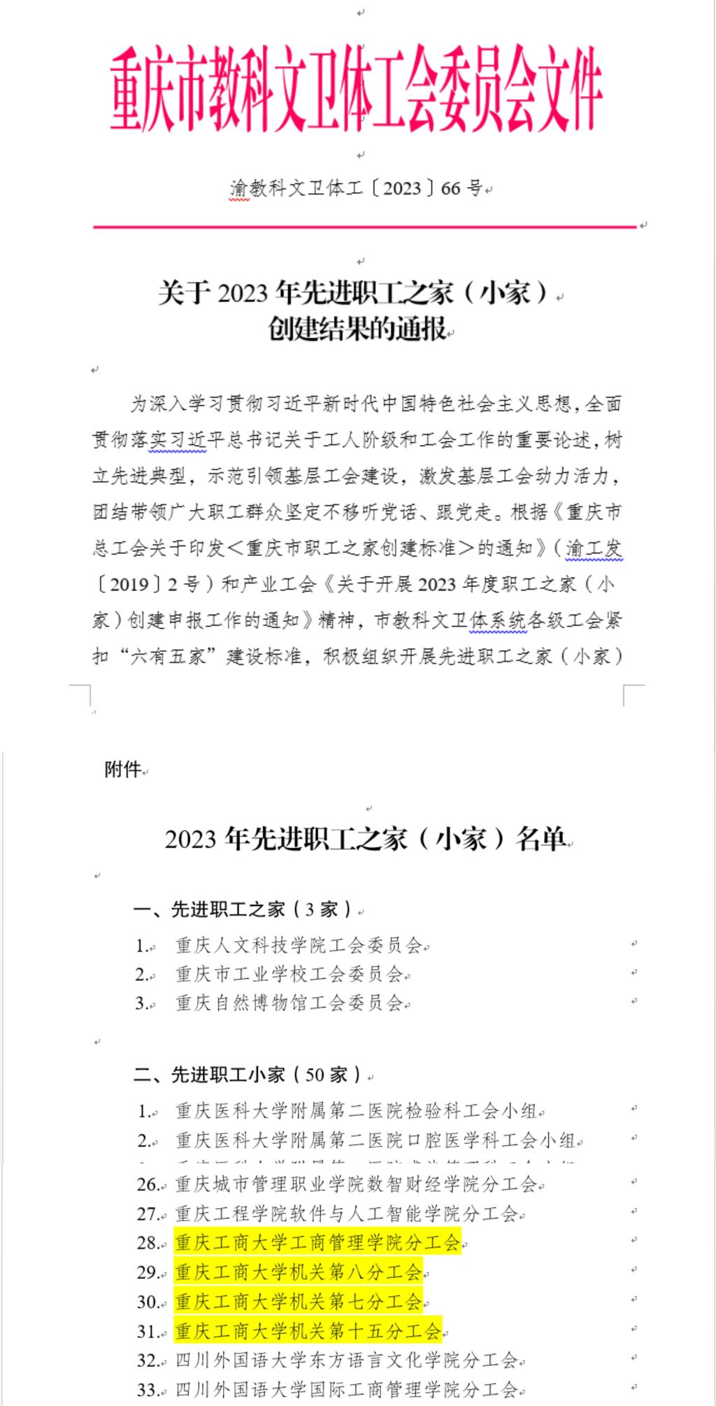 同时,重庆市教科文卫体工会委员会发布《关于2023年先进职工之家(小家)创建结果的通报》,我校工商管理学院工会、机关工会第七分工会、机关工会第八分工会、机关工会第十五分工会四家职工小家荣获重庆市教科文卫体工会系统先进职工小家荣誉称号。