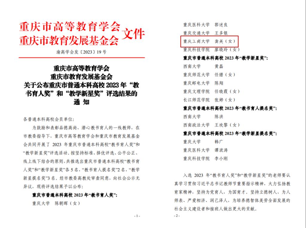 为鼓励和表彰品德高尚、潜心教书育人的一线教师,在市教委指导下,重庆市高等教育学会和重庆市教育发展基金会共同开展了2023年重庆市普通本科高校“教书育人奖”和“教学新星奖”评选活动。按坚持标准、择优评选、公平公正、线上线下结合的原则,共推选出重庆市普通本科高校“教书育人奖”和“教学新星奖”各5名,“教书育人提名奖”2名,“教学新星提名奖”3名。我校管理科学与工程学院教师龚英获评重庆市普通本科高校“教书育人奖”。