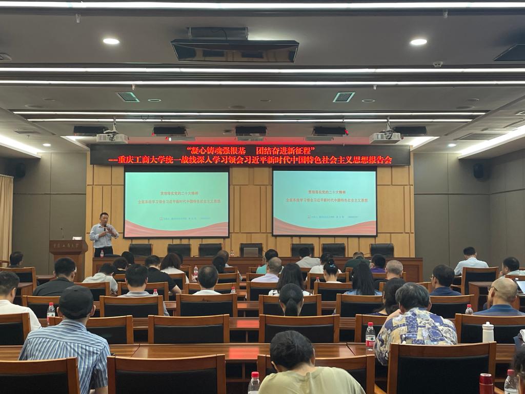 为全面贯彻落实中共二十大精神,推进校内各民主党派、无党派人士和党外知识分子持续深入开展“凝心铸魂强根基 团结奋进新征程”主题教育,学深悟透笃行习近平新时代中国特色社会主义思想,不断巩固与中国共产党团结奋斗的共同思想政治基础。9月22日下午,我校在新图书馆会议中心一会议室举行“凝心铸魂强根基 团结奋进新征程”——8xbet体育登录统一战线深入学习领会习近平新时代中国特色社会主义思想报告会,邀请重庆社会主义学院多党合作研究室的秦江明教授做主题报告,我校各民主党派基层组织和统战团体班子成员、成员代表共60余人参会。会议由学校党委常委、统战部常务副部长陈松主持。