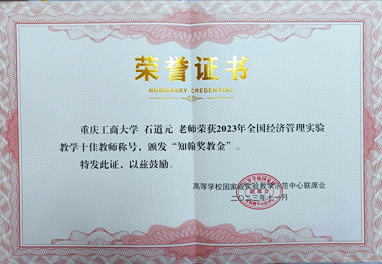 11月18-19日,由国家级实验教学示范中心联席会经济与管理学科组主办的第二十四届全国高校经管类专业实验室建设暨经济管理实验教学示范中心建设研讨会在武汉召开。会议同期举行了“全国高校优秀实验教师”表彰颁奖仪式,我校会计学院石道元教授获评“2023年全国经济管理实验教学十佳教师”,我校经济管理实验教学中心粟丽历副教授获评“2023年全国金融实验教学十佳教师”。