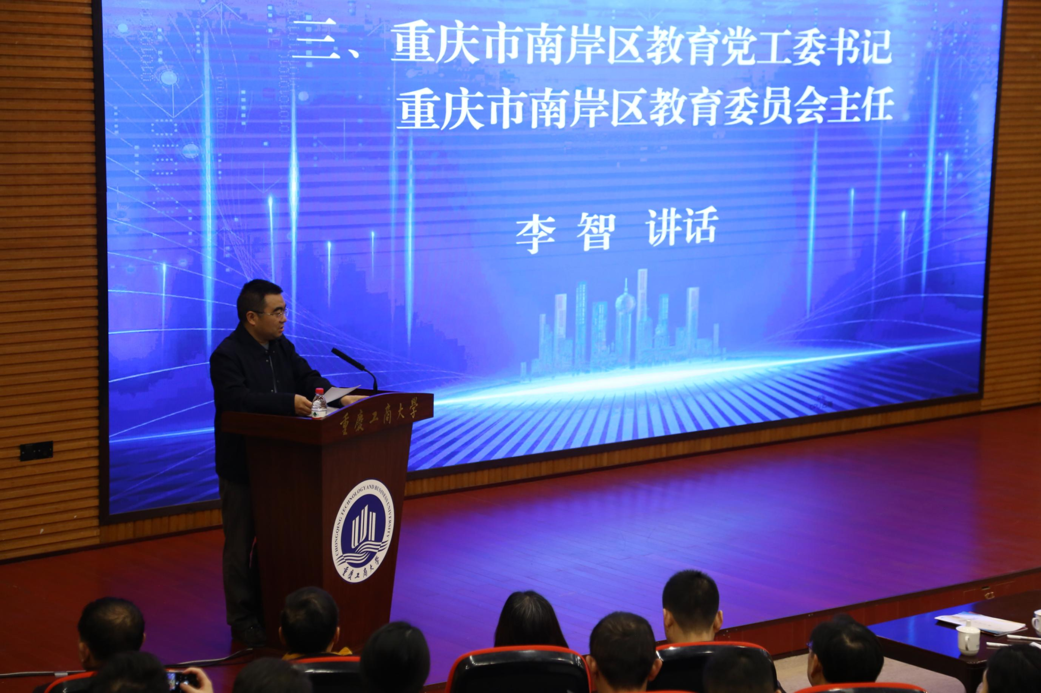 李智代表重庆市南岸区委教育工委讲话。他介绍了南岸区“书香南岸,幸福教育”发展理念以及优质均衡教育发展举措与成就,强调了继续教育与地方发展的融合性、协同性和创新性。