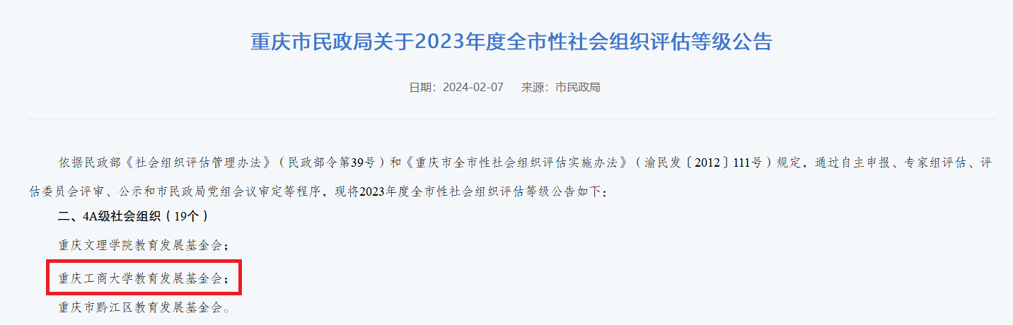 近日,重庆市民政局发布《重庆市全市性社会组织2023年评估等级结果公示》,我校基金会获评4A级社会组织。此次接受重庆市社会组织等级评估是我校基金会自成立以来首次。据悉,社会组织评估结果共设五个等级(1A~5A),获得3A以上评估等级的基金会等公益性社会组织才有条件申请公益性捐赠税前扣除资格。4A是重庆市民政局对社会组织评估新规则下首次迎评基金会能够获得的最高等级。
