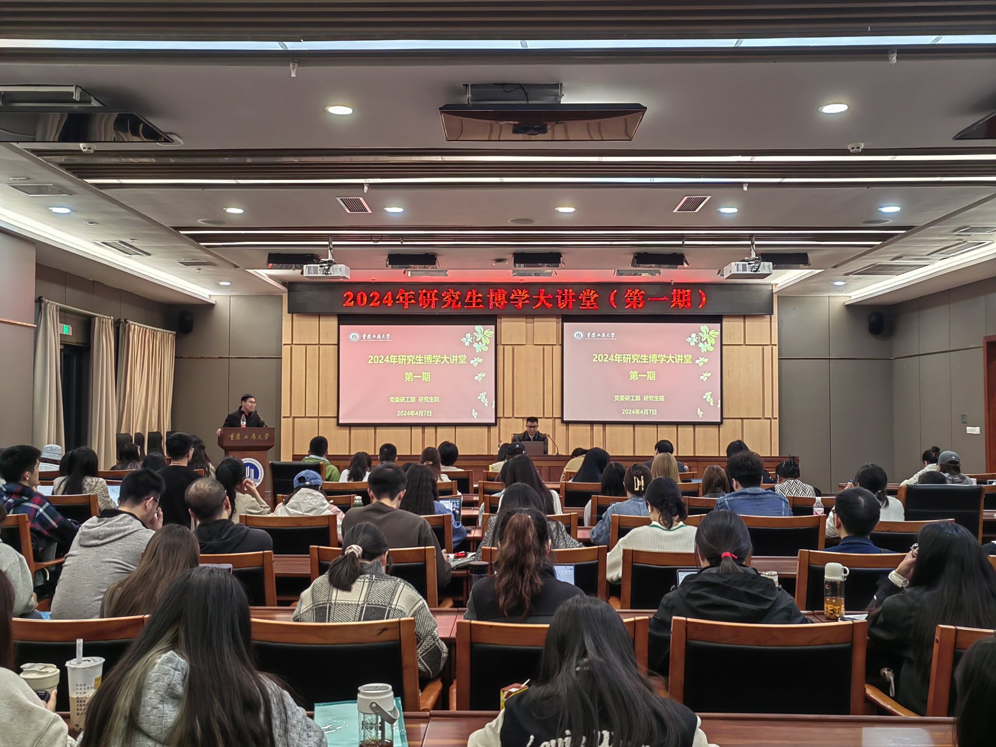 4月7日晚,2024年研究生博学大讲堂第一期在我校新图书馆会议中心一会议室举行。学校党委常委、副校长李敬教授就“加快发展新质生产力,积极推动高质量发展”作专题讲座,研究生院领导以及各培养单位110余名研究生参加了本次活动。讲座由研工部部长、研究生院院长田双全教授主持。