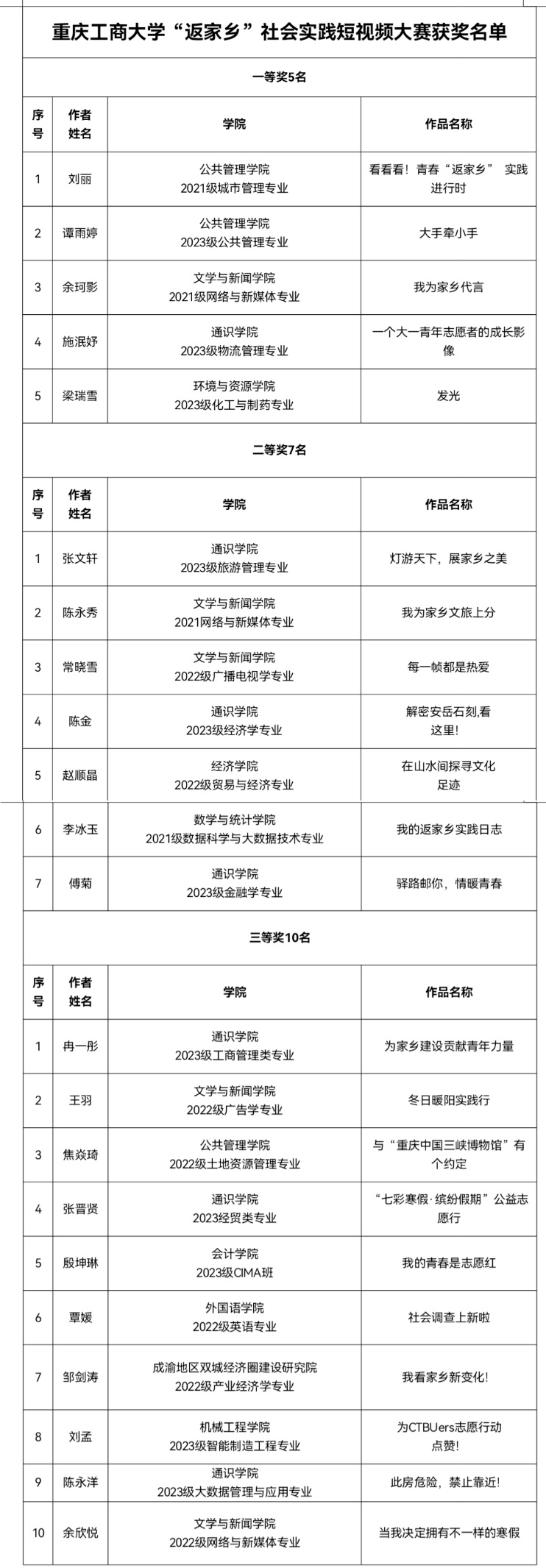 近日,由校团委主办的“以青春之名,赴家乡之约”返家乡社会实践短视频大赛圆满落幕,来自全校10个学院部门、22个学生团队或个人在比赛中获奖。参赛作品围绕政务实践、企业实践、乡村振兴、公益服务、社会服务、文化宣传等领域,创作内容鲜活的返家乡社会实践短视频,展现我校青年学子用奋斗践行使命担当。