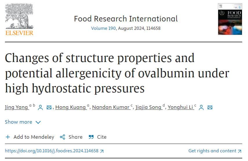 近日,我校食品科学与工程学院杨景副教授(第一作者兼通讯作者)与美国堪萨斯州立大学谷物科学与工业系李永辉副教授(通讯作者)等在食品领域国际期刊《Food Research International》发表了题为“Changes of structure properties and potential allergenicity of ovalbumin under high hydrostatic pressures”的研究论文。