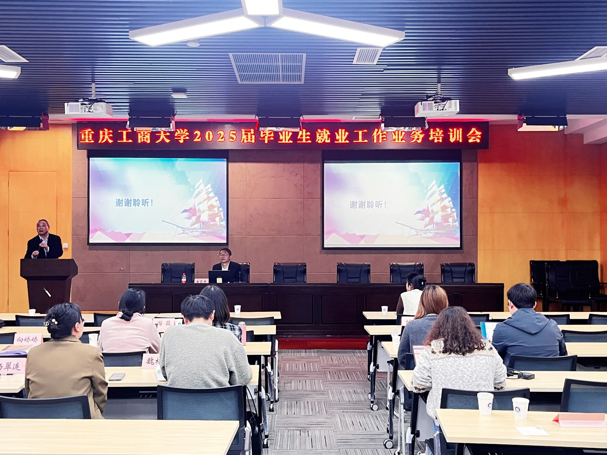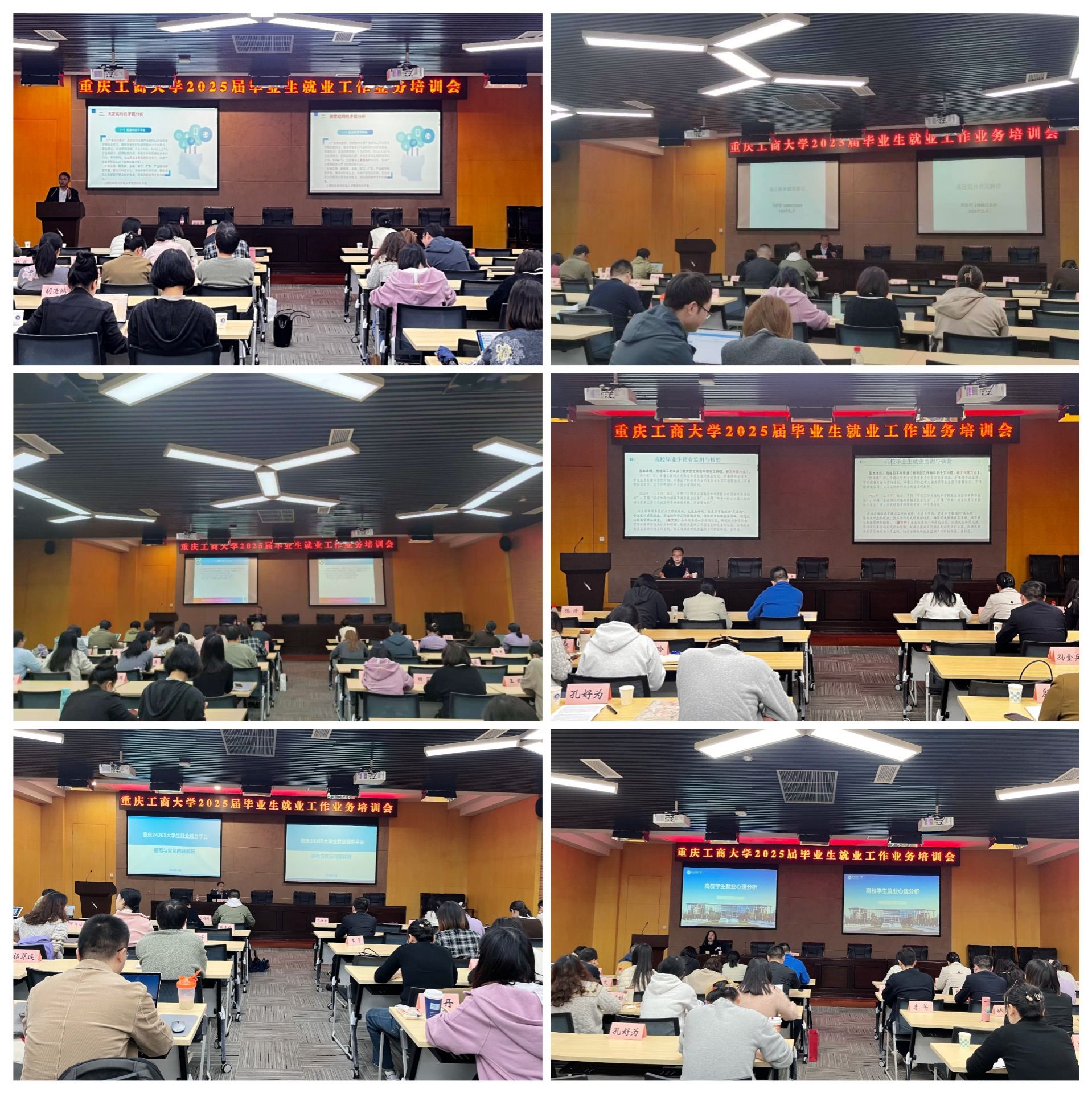 11月7日—8日,我校在图书馆多功能厅召开2025届毕业生就业工作业务培训会。会议邀请了重庆市学生就业与创新创业服务中心主任唐雪平、纪检委员郑胜利、综合服务部部长许杨、就业指导部部长尹亮、信息市场部副部长卜靖,西南政法大学行政法学院党委副书记胡晓开展培训。学校党委常委、副校长李国军,招生就业处处长钟增胜、副处长周婷出席会议,招生就业处就业中心全体人员,各学院就业联络员、全体2025届毕业班辅导员,《大学生职业生涯规划与就业指导》授课教师参加培训。会议由周婷主持。