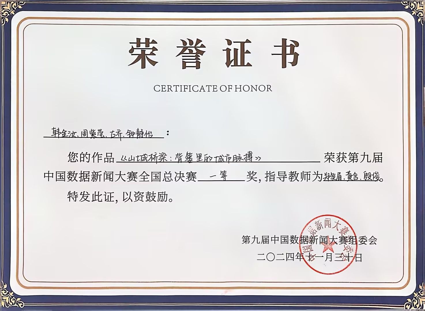 11月30日,第九届中国数据新闻大赛(全国总决赛)暨第二届“新一代人工智能信息传播与社会治理”主题论坛在华中科技大学隆重举办。我校文学与新闻学院2023级研究生韩金汝、古乔、周紫莹、钟静怡的作品《山城桥梁:背篓里的城市脉搏》获全国总决赛一等奖。