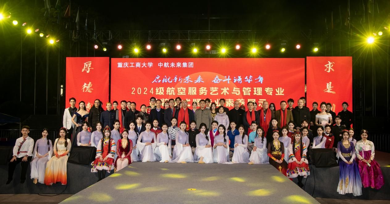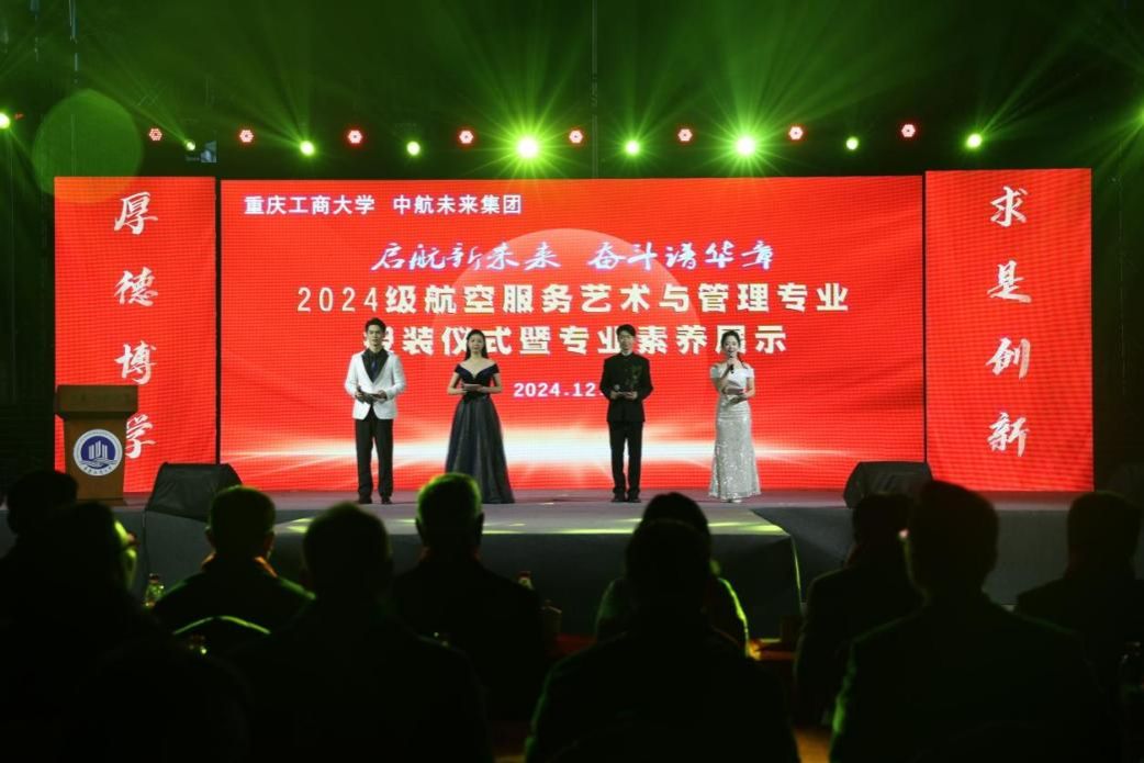 12月11日,学校艺术学院航空服务艺术与管理专业制服授装仪式暨专业素养展示在南岸校区含弘广场举行。学校党委常委、副校长张波、李国军、柏群、任毅,北京中航未来教育集团董事长刘永、副总裁张鹏、教研总监张利及学校党政办公室、党委宣传部、党委学工部、党委保卫处、发展规划处、招生就业处等职能部门负责人、艺术两院师生代表和全体2024级航空服务艺术与管理专业学生参加了活动。