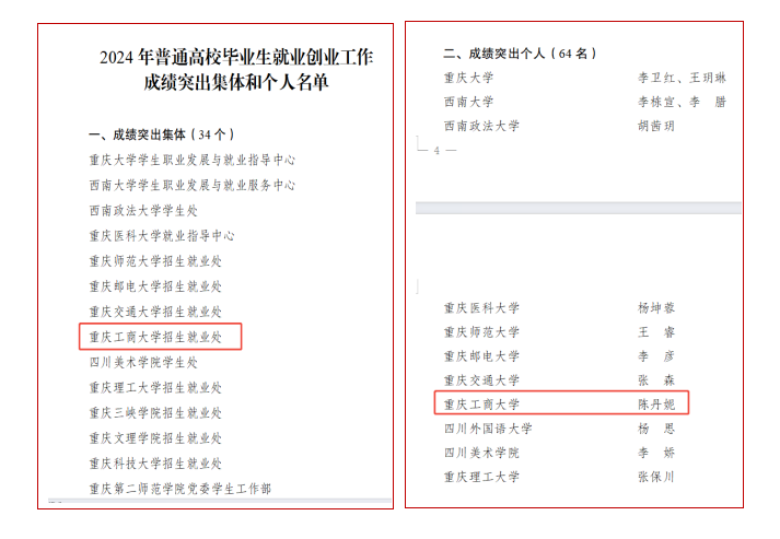 近日,重庆市教育委员会、重庆人力资源和社会保障局下发《关于表扬2024年普通高校毕业生就业创业工作成绩突出集体和个人的通报》(渝教学函〔2025〕11号),对2024年重庆市普通高校毕业生就业创业工作成绩突出集体和个人进行了表彰。