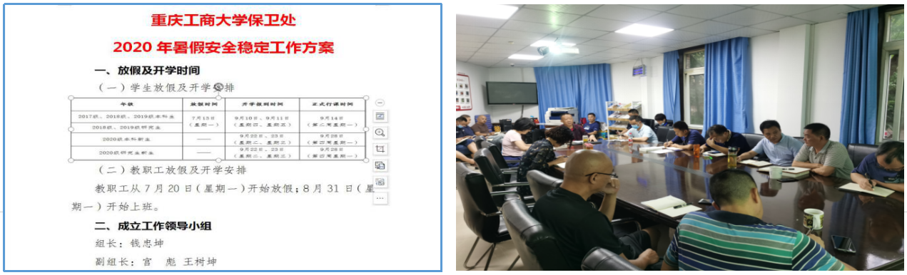 为圆满完成暑期校园封闭式管理和安全稳定工作,根据7月16日学校第五次中层干部会议精神和《关于2020年暑假放假及开学安排的通知》安排,按照分管校领导的要求,保卫处高度重视,提前制定了《8xbet体育登录保卫处2020年暑假安全稳定工作方案》,细化了《8xbet体育登录保卫处2020年暑期值班安排表》,并于7月17日上午召开全处干部大会,对暑期校园疫情防控和安稳工作进行了周密部署。