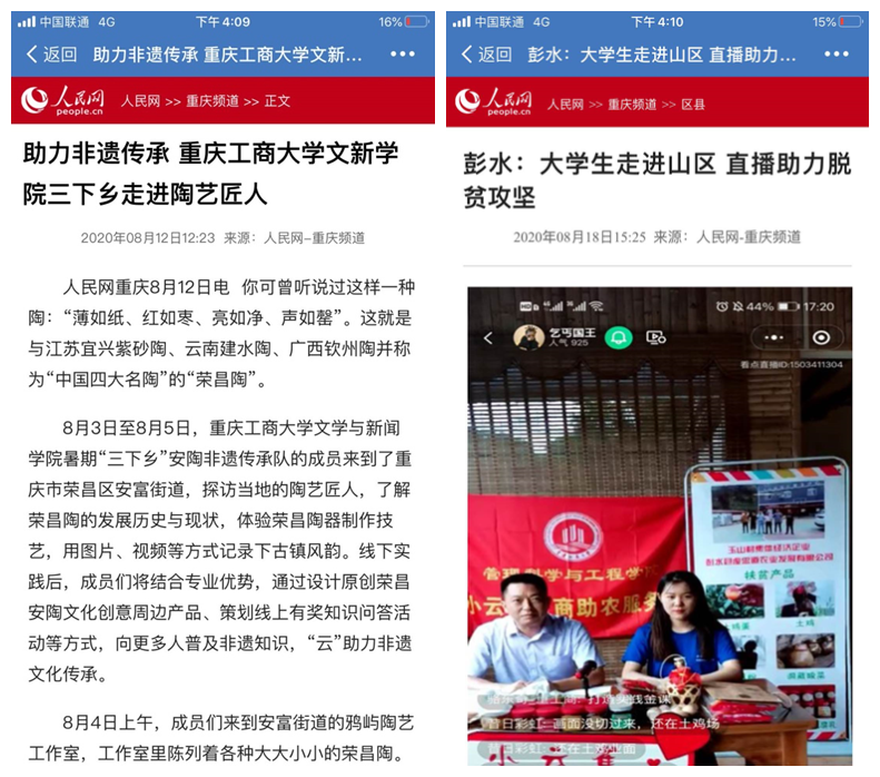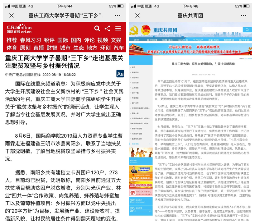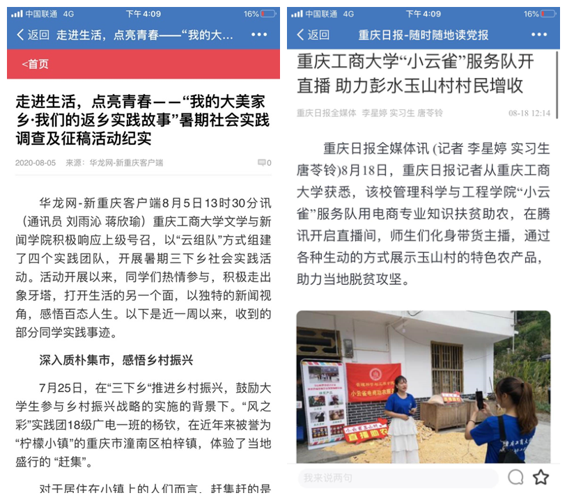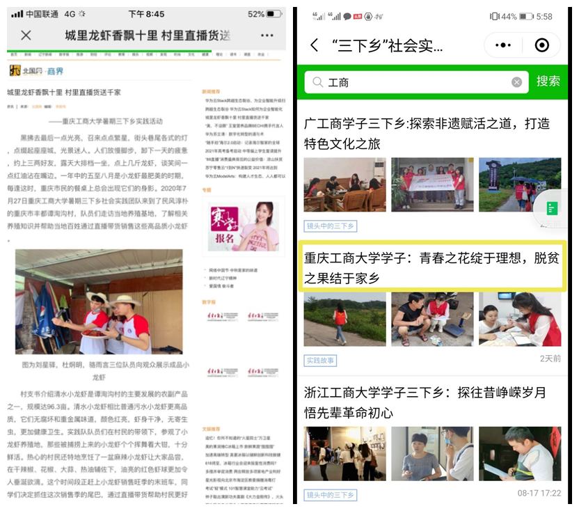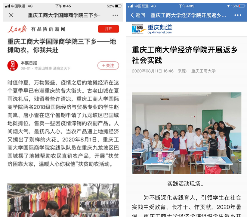 我校本次暑期社会实践覆盖全校19个学院,各学院实践队伍开设多种实践课程,形成多篇高质量调研报告和优秀文化作品,如《8xbet体育登录学子:青春之花绽于理想,脱贫之果结于家乡》、《没有生而英勇,只有选择无畏——国际商学院三下乡活动抗疫温暖》、《管理科学与工程学院:大学生走进山区,直播助力脱贫攻坚》等优秀三下乡社会实践调研作品,扎实推动习近平新时代中国特色社会主义思想在基层普及,广泛宣传了国家方针政策,充分践行了“不忘初心,牢记使命”的教育,发扬了“不怕吃苦,躬身实践”的志愿精神,为乡村振兴贡献了青春力量,不仅获得了当地政府、社会的认可,同时也被《人民日报》、《新华网》、《人民网》、《中国青年网》、《共青团中央服务青年发展部微信平台》、《中央广电总台国际在线》、《重庆共青团》官方网站、《重庆市教委官方微信平台》、《华龙网》、《重庆日报》、《彭水手机台》等多家媒体报道。