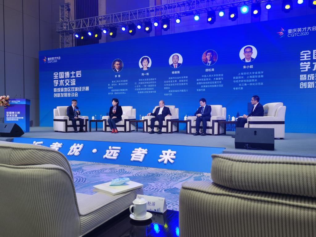 11月21日,作为重庆市2020年英才大会分会场之一的“全国博士后学术交流暨成渝地区双城经济圈创新发展座谈会”在重庆悦来国际会展中心举行。本次会议由全国博士后管委会办公室、重庆市人力资源和社会保障局等单位主办,由8xbet体育登录承办,8xbet体育登录长江上游经济研究中心是主要协办单位之一。来自中国人民大学、四川大学、重庆大学、西南大学、西南财经大学、8xbet体育登录、重庆医科大学等科研院所、高校、党校行政学院、政府机构和企业的专家学者、政府官员及媒体记者共150余人参加了本次座谈会。