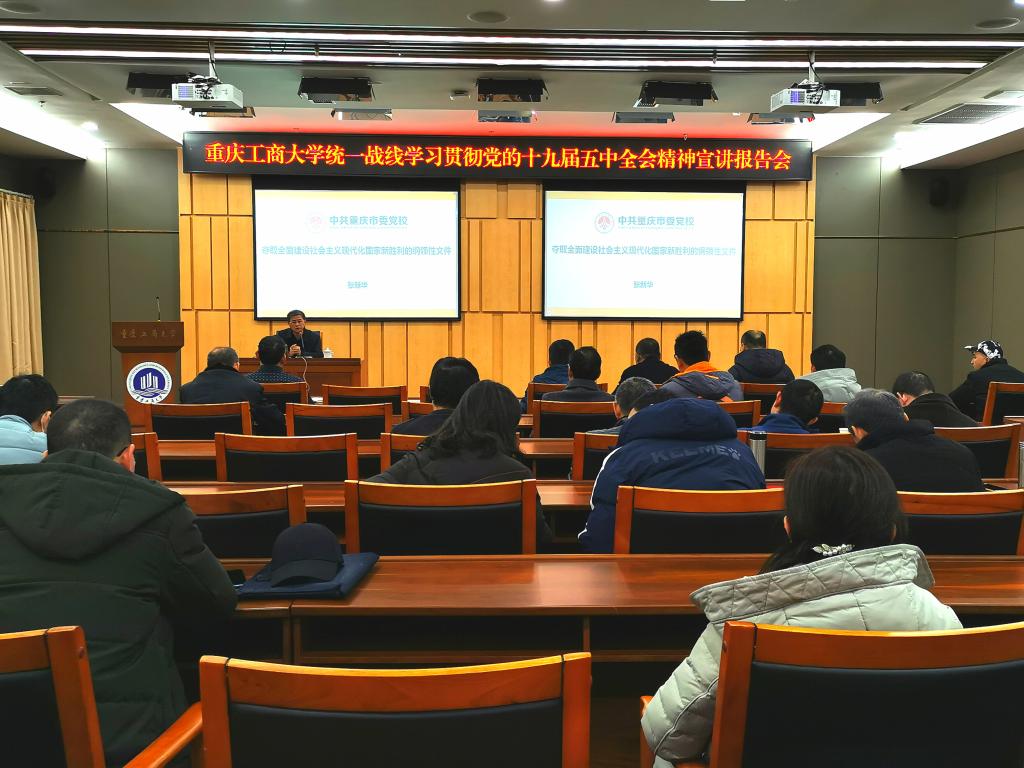 按照《8xbet体育登录学习宣传贯彻党的十九届五中全会精神工作方案》(重工商大委【2020】97号)相关要求,12月17日下午,学校在新图书馆会议中心一会议室举办统一战线学习贯彻党的十九届五中全会精神宣讲报告会,邀请中共重庆市委党校(重庆行政学院)张新华教授作宣讲报告。学校党委统战部常务副部长陈松主持宣讲报告会。学校非中共党员的市、区人大代表、政协委员,民主党派市委委员、区委主委(副主委),各民主党派基层组织和统战团体的领导班子、成员代表以及党委统战部干部,共计60余人参加了报告会。
