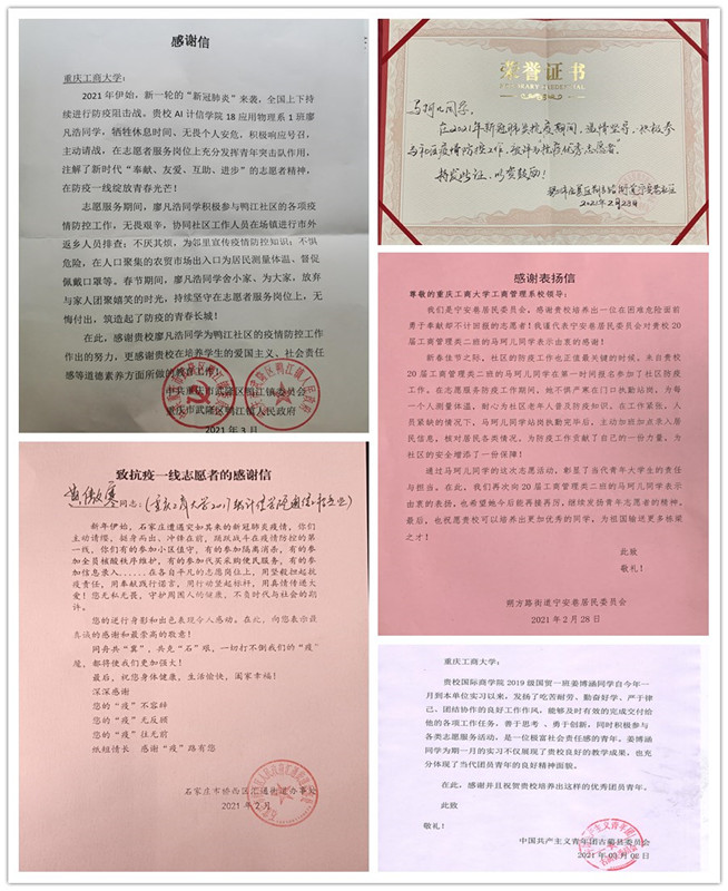 此外,3月校团委、各学院分团委陆续收到感谢信,我校数名志愿者寒假期间参与家乡抗疫志愿服务得到认可和表扬;27日、30日,百余名志愿者为校内新冠疫苗集中接种提供了志愿服务。