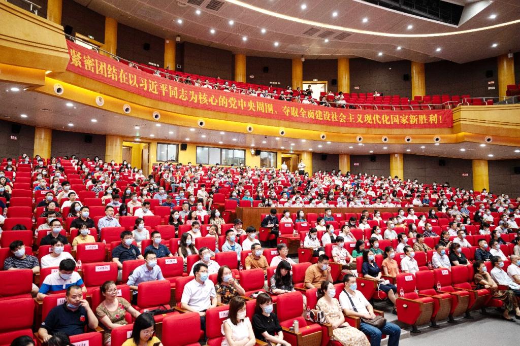 报告厅内,全体党员师生佩戴党徽,心潮澎湃地观看直播,场内不时响起阵阵掌声,气氛热烈。