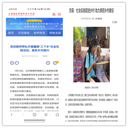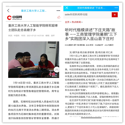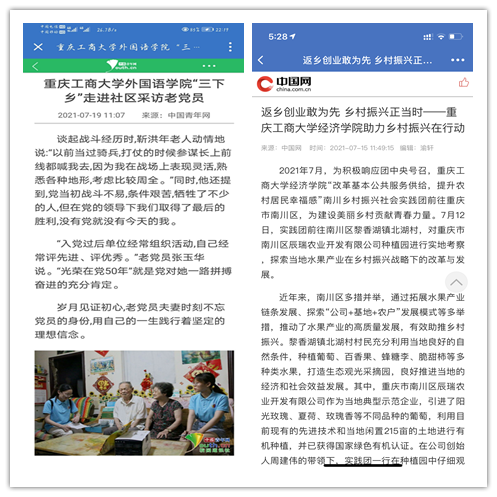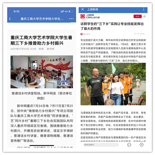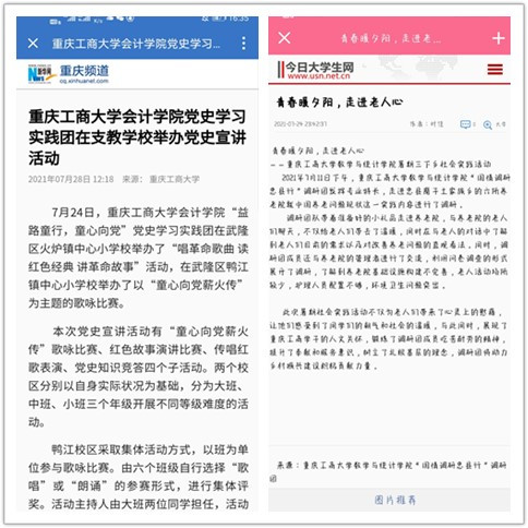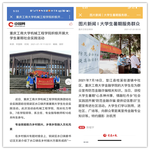 在实践活动期间,各学院创作多种类型的高质量社会实践作品,如《益路童行,童心向党--8xbet体育登录会计学院党史学习实践团在支教学校举办党史宣讲活动》《重庆工商学子赴古蔺县 看贫困户"搬"出幸福新生活》《返乡创业敢为先 乡村振兴正当时——8xbet体育登录经济学院助力乡村振兴在行动》《脱贫不忘来时路,乡村振兴靠大家——8xbet体育登录工商管理学院暑期“三下乡”实践团深入重庆市巫山县下庄村》等,引领广大青年学生在扎根中国大地的生动实践中增强“四个意识”、坚定“四个自信”、做到“两个维护”。实践团深入乡村基层,走访调查,理论宣讲,服务社会,在社会实践的亲身经历中受教育、长才干、做贡献,得到了当地群众及社会的认可,同时实践活动被新华网、人民网、中国青年网、央广网、中国网、中视网、重庆晚报、上游新闻、中国教育在线等多家媒体报道。