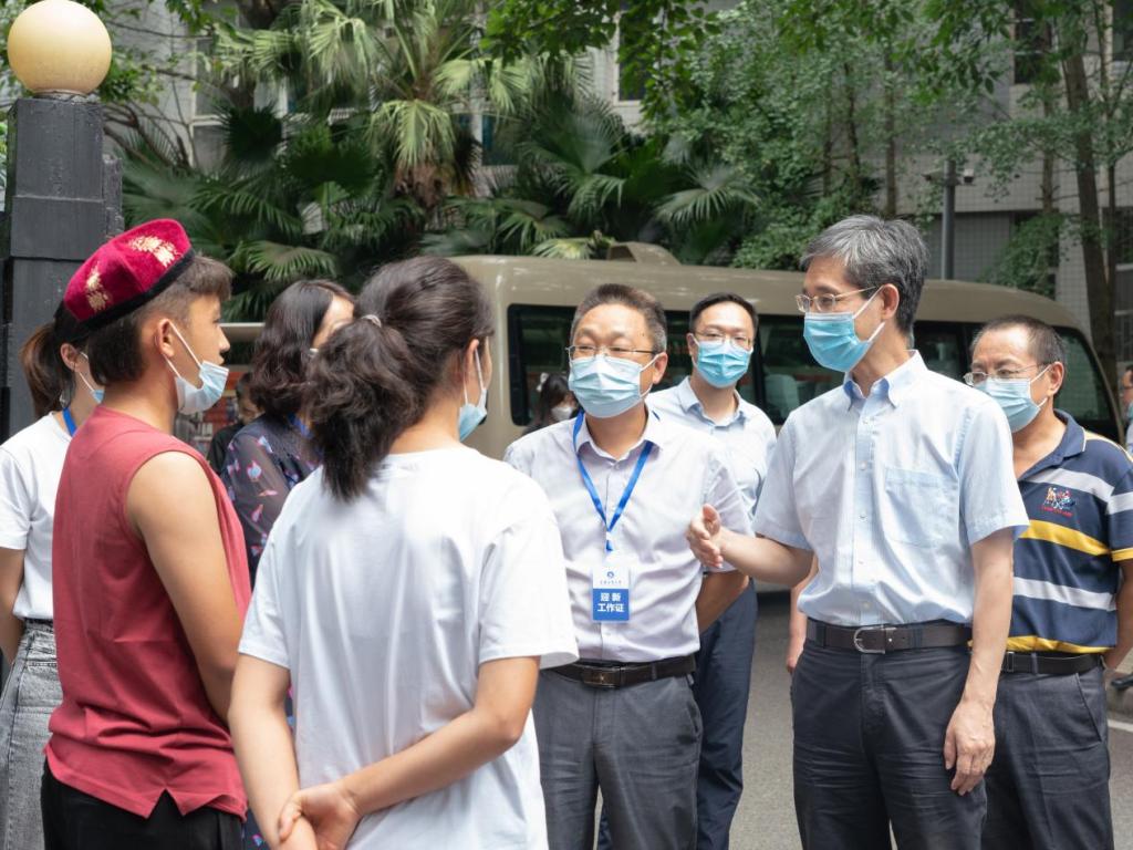 9月8日,孙芳城一行到兰花湖片区、学生食堂、公寓楼检查迎新工作,并前往宿舍看望新生。孙芳城慰问了河南受灾新生、新疆维吾尔族新生、重庆彭水建档立卡新生。孙芳城指出,学校要为特殊新生开辟绿色通道,为同学们的生活做好后勤保障,解决新生的实际问题,营造良好的学习生活环境;要做好“开学第一课”的准备工作,上好新同学的第一堂课;各学院、有关部门要关注新生的心理健康与生活状况。孙芳城希望,2021级新生能够珍惜时光,脚踏实地,刻苦学习,打牢专业基础,发挥专业优势,主动将个人发展融入党和国家发展大局,立志做爱国奉献、许党报国的重工商大人。