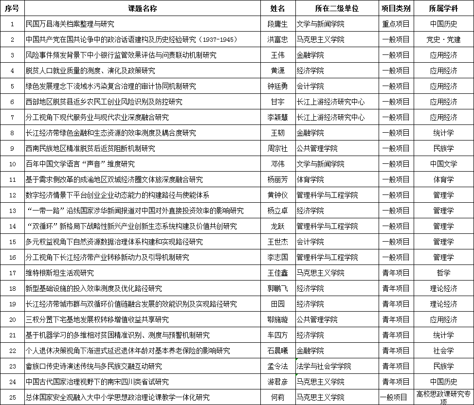 近日,全国哲学社会科学规划领导小组公布了2021年国家社科基金年度项目和国家社科基金高校思政课研究专项立项名单,2021年度我校获得的国家社科基金项目立项资助项目数为25项,立项数创历史新高,其中,重点项目1项,一般项目15项,青年项目8项,思政课研究专项项目1项。