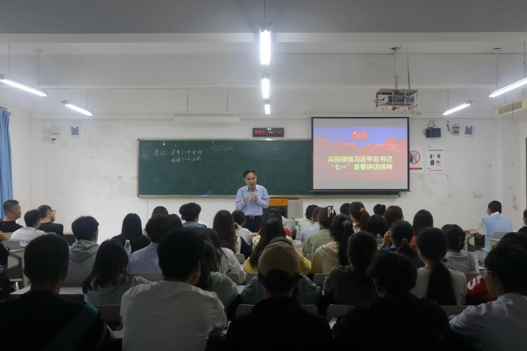 10月8日上午,我校党委书记李志雄为2020级工商管理专业学生上形势与政策课,宣讲习近平总书记“七一”重要讲话精神。