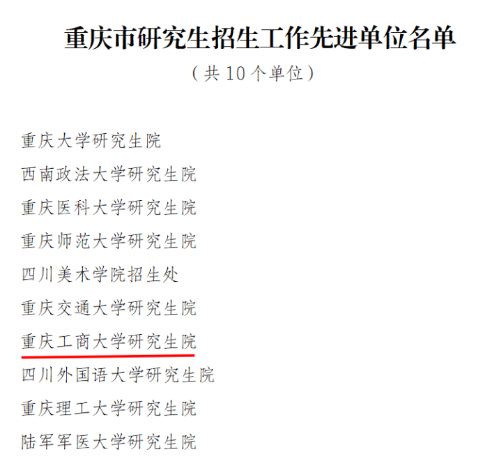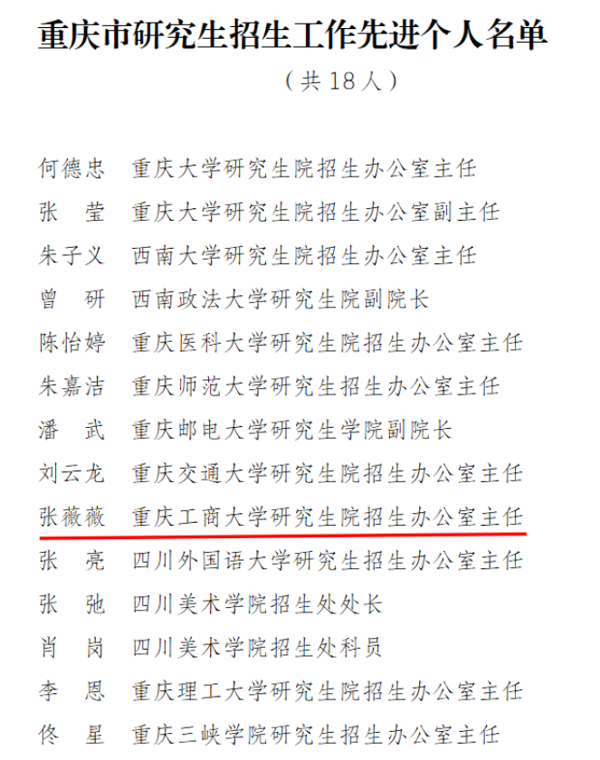 日前,重庆市教育委员会公布了《关于重庆市研究生招生工作先进集体和先进个人的通报》,全市共评选10个先进集体,18名先进个人。我校研究生院被评为重庆市研究生招生工作先进集体,张薇薇老师被评为重庆市研究生招生工作先进个人。